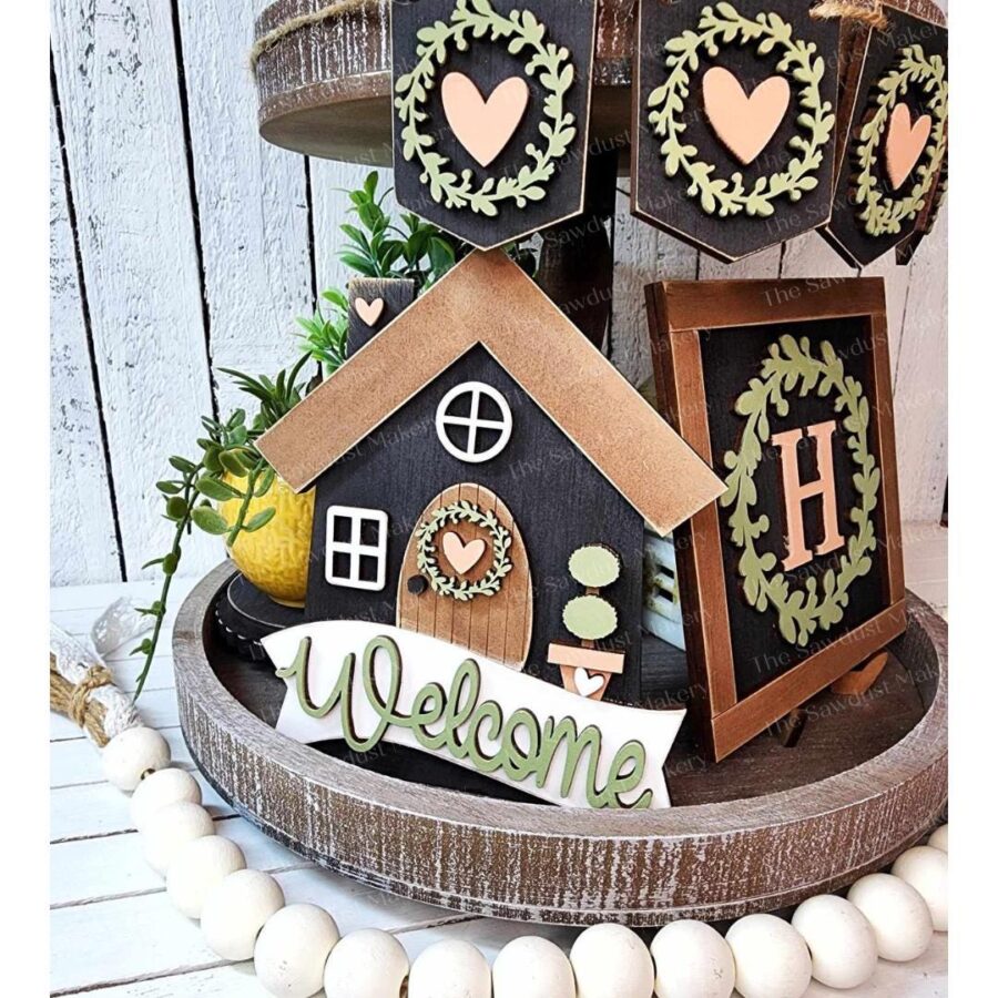 Bandeja escalonada de bienvenida a casa SVG para corte láser – Decoración personalizada de hogar dulce hogar