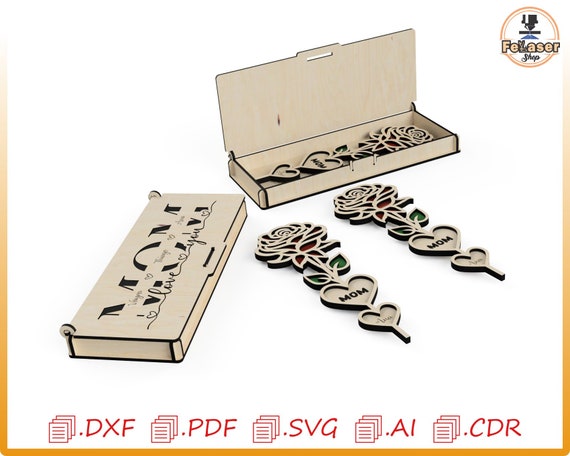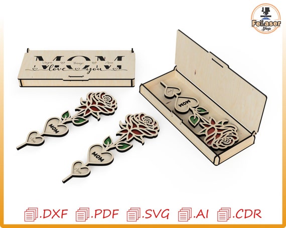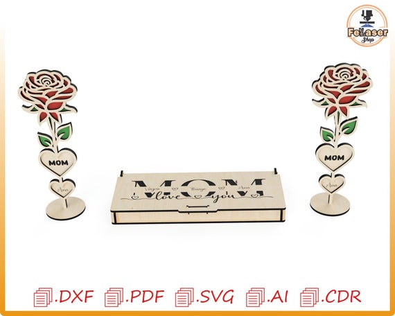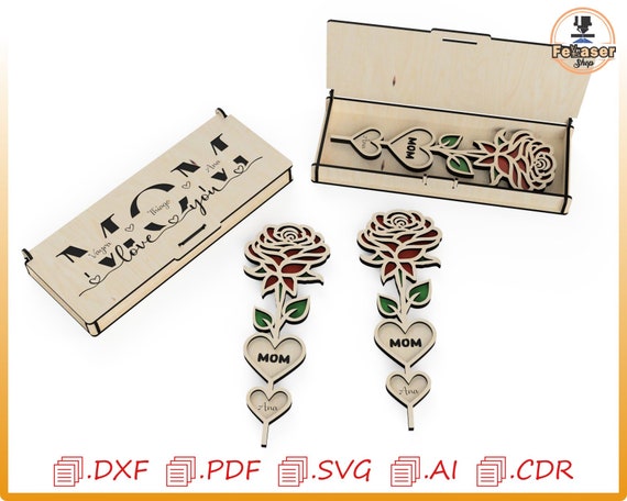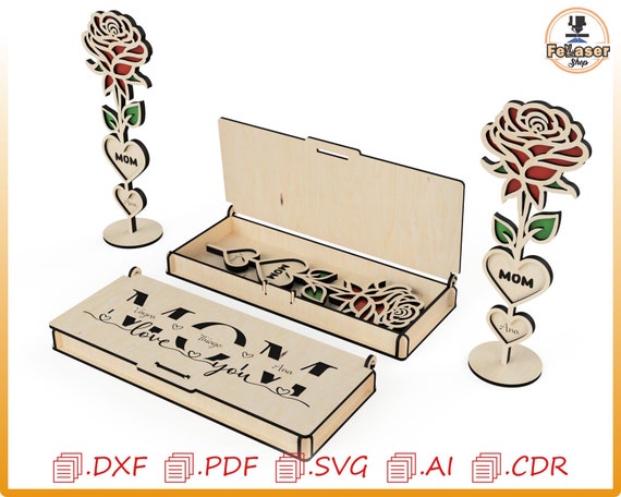 Caja regalo para mamá con flores cortada con láser: archivos vectoriales (descarga digital)