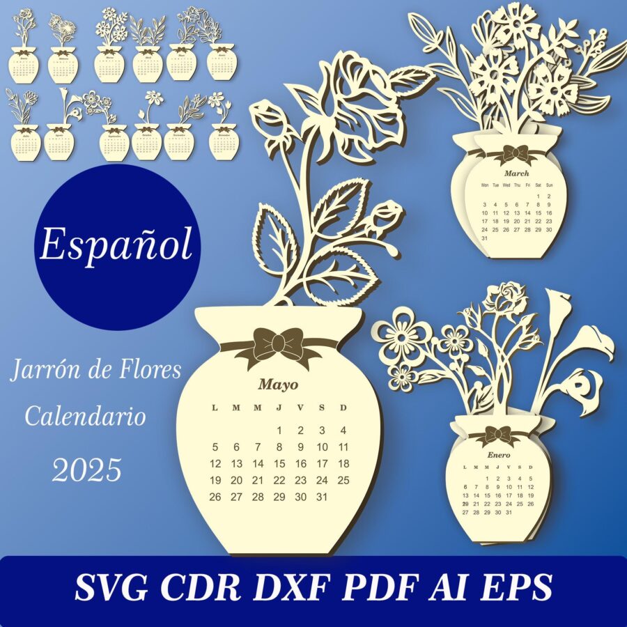 Calendario de jarrones de flores 2025 – Archivos SVG, DXF, AI y PDF para corte láser
