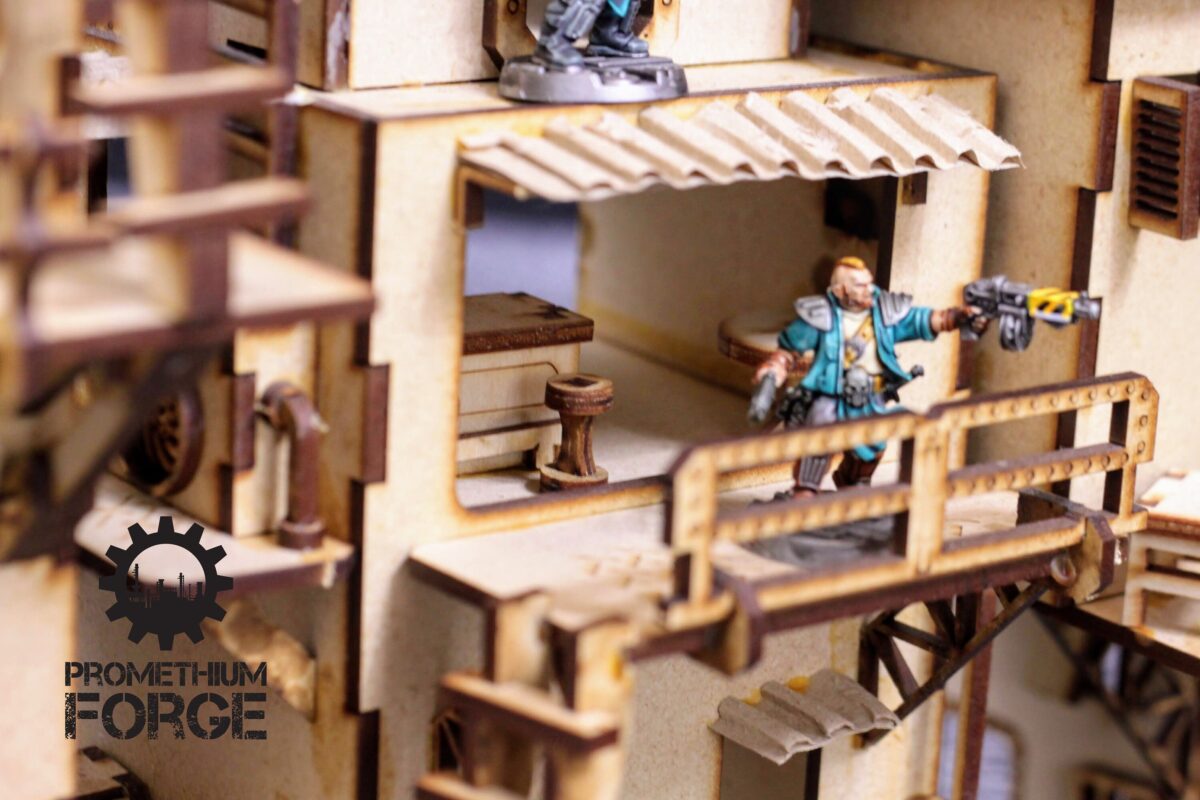 🔧 Además, puedes ajustar las alturas de los pisos a tu gusto e integrarlo fácilmente con otros terrenos de 5”, lo que te da flexibilidad para crear el espacio ideal. Cada edificio cuenta con paredes removibles, permitiéndote modelar el interior o mover miniaturas durante tus partidas. ¡Y no te preocupes por el mobiliario! El conjunto viene con mesas, sillas, camas, literas, un armario, fregadero, barra, taburetes y terminales de ordenador.