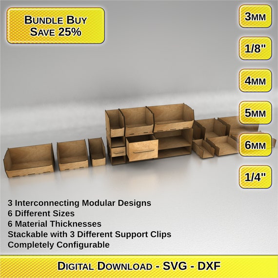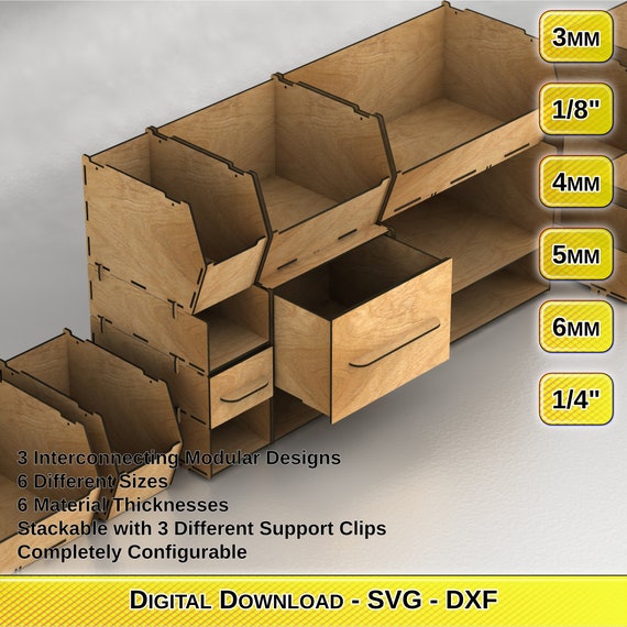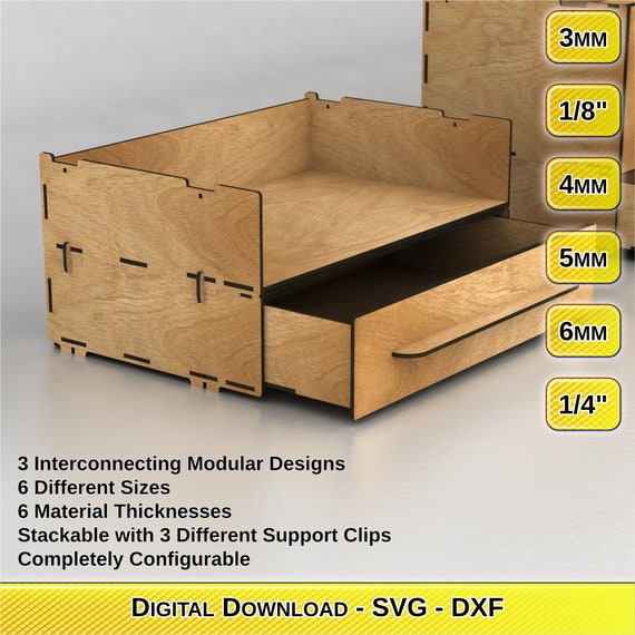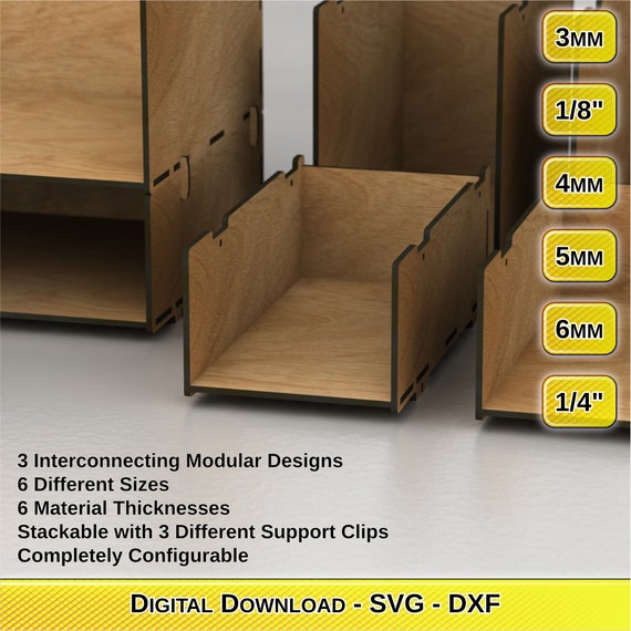 🗄️ ¡Transforma tu espacio de trabajo con nuestros diseños de almacenamiento modular cortados con láser! Esta descarga digital incluye un paquete de 2 productos en 1, con 3 diseños únicos: contenedores, cajones y bandejas, que se interconectan para ofrecerte una solución de almacenamiento completamente personalizable. 🎨