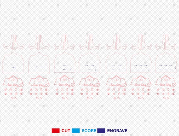 - Las líneas azules del diseño son para grabar y las líneas rojas para cortar. Asegúrate de que tu software y máquina sean compatibles con todos los formatos incluidos.