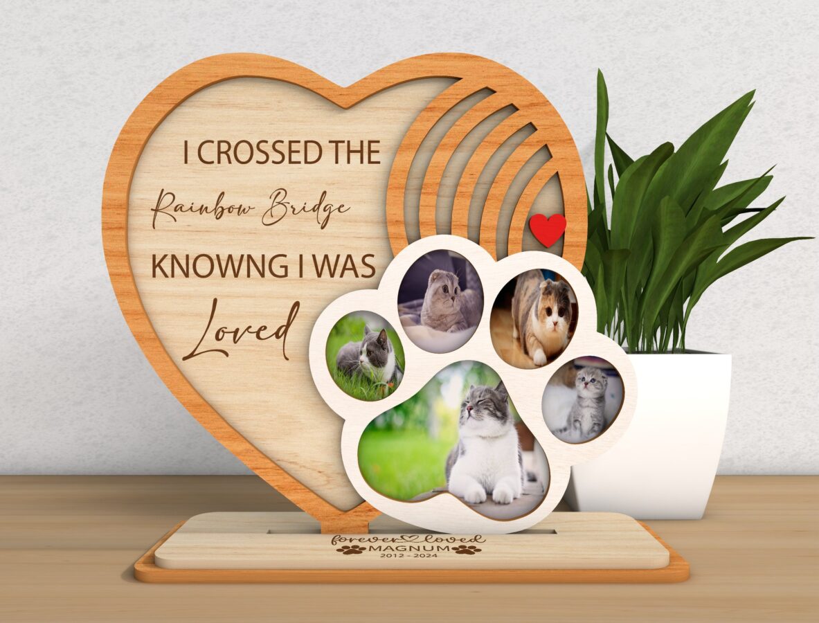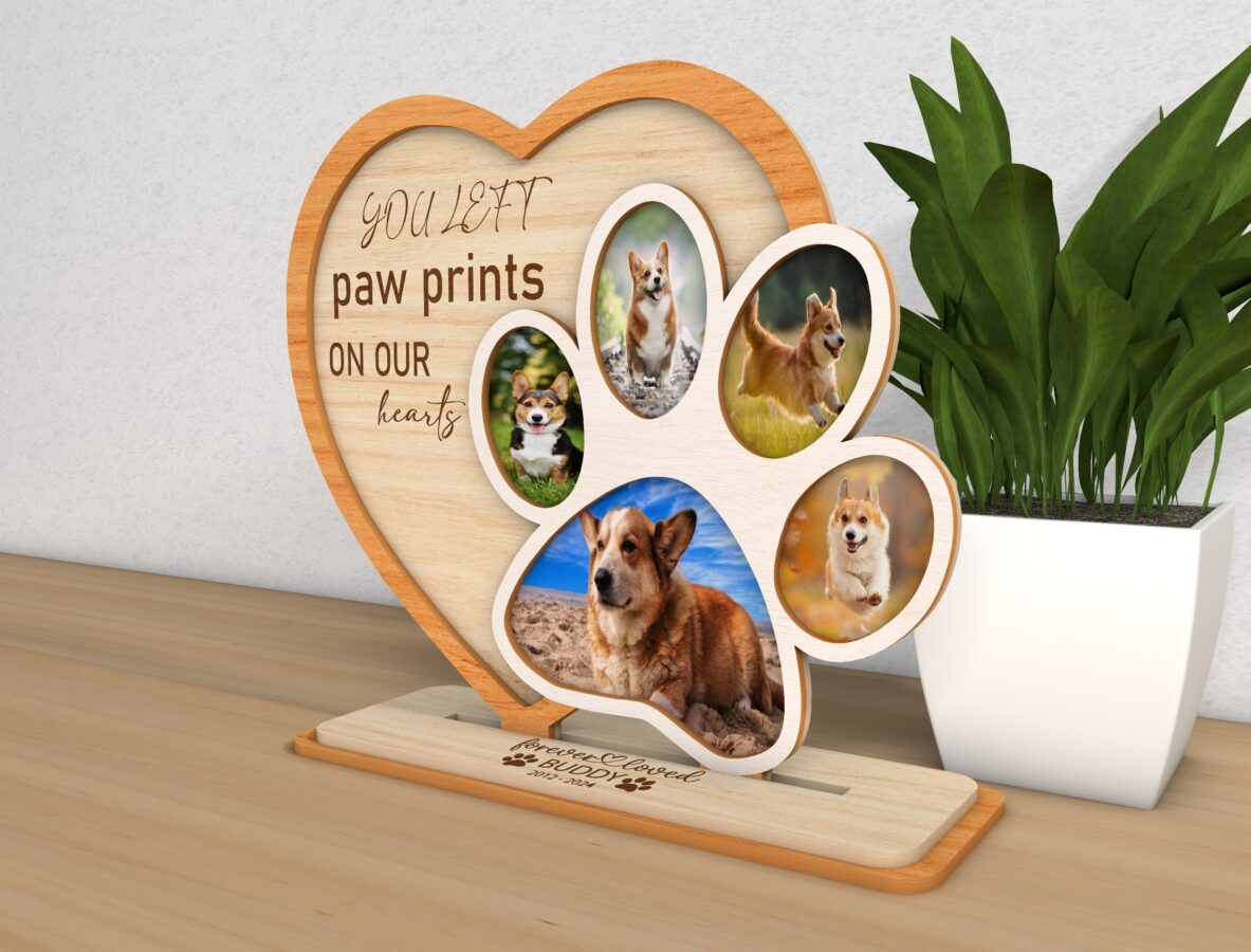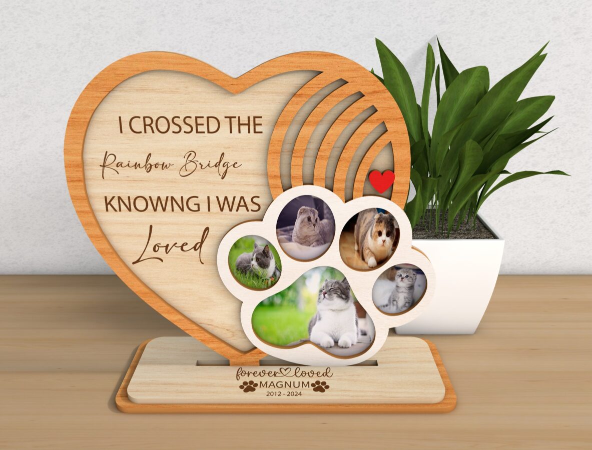 🌟 Celebra la vida de tus mascotas con nuestro marco conmemorativo, una hermosa forma de preservar sus recuerdos. Este archivo digital de corte láser incluye todo lo que necesitas para crear un bello recuerdo de tus perros y gatos.