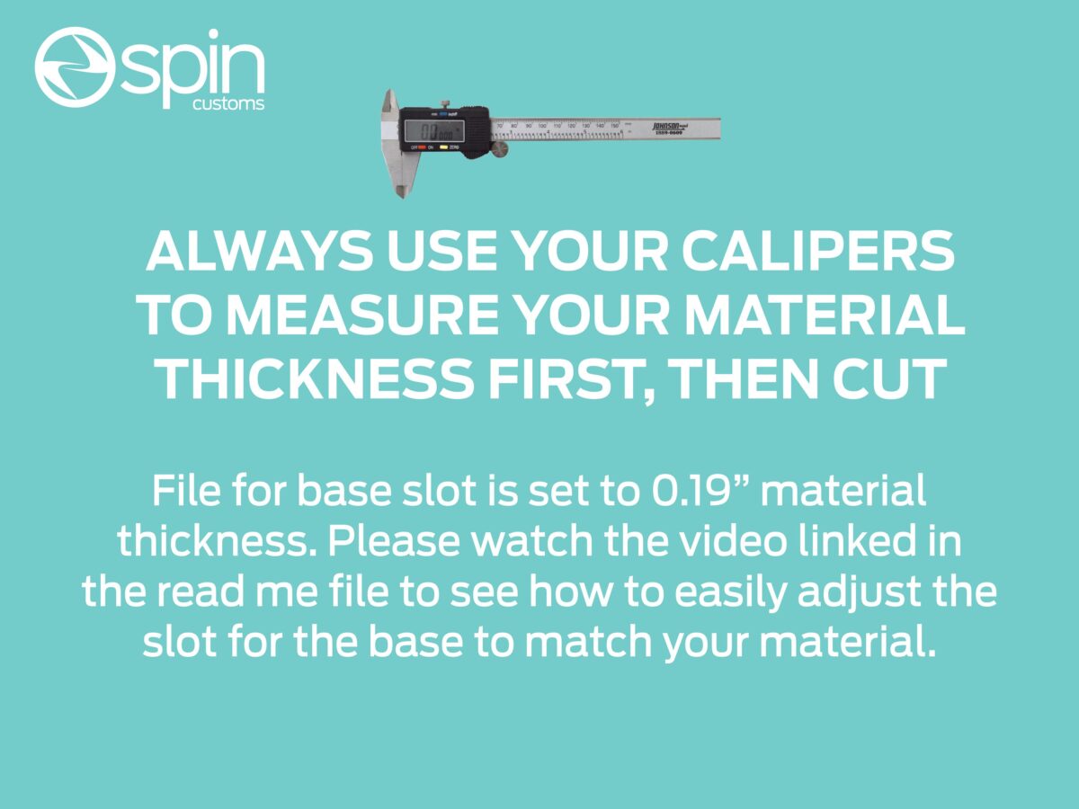 🔍 Importante: Antes de cortar, asegúrate de medir el grosor del material con un calibrador y ajustarlo adecuadamente. Te recomendamos ver el video de ensamblaje para entender cómo ajustar la ranura de la base; se sugiere que el orificio sea 0,007″ más pequeño que el grosor del material para asegurar un ajuste perfecto.