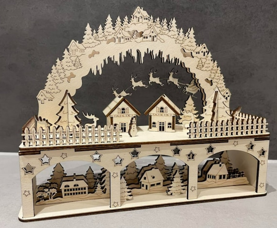 ✨ Este diseño encantador es perfecto para decorar velas y crear manualidades únicas. El arco de velas presenta la silueta de un pintoresco pueblo de montaña rodeado de abetos, ideal para agregar un toque navideño. Puedes integrar fácilmente una pequeña cadena de luces para iluminar el arco y realzar la atmósfera festiva.