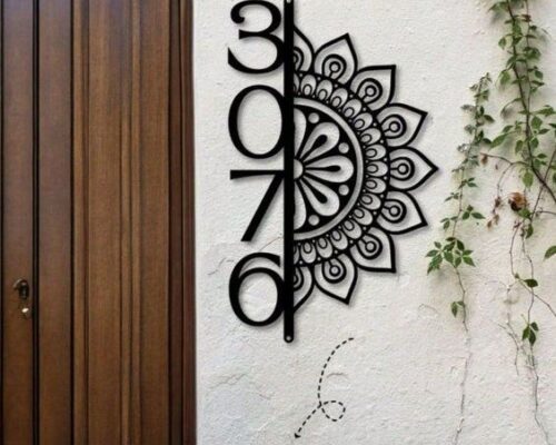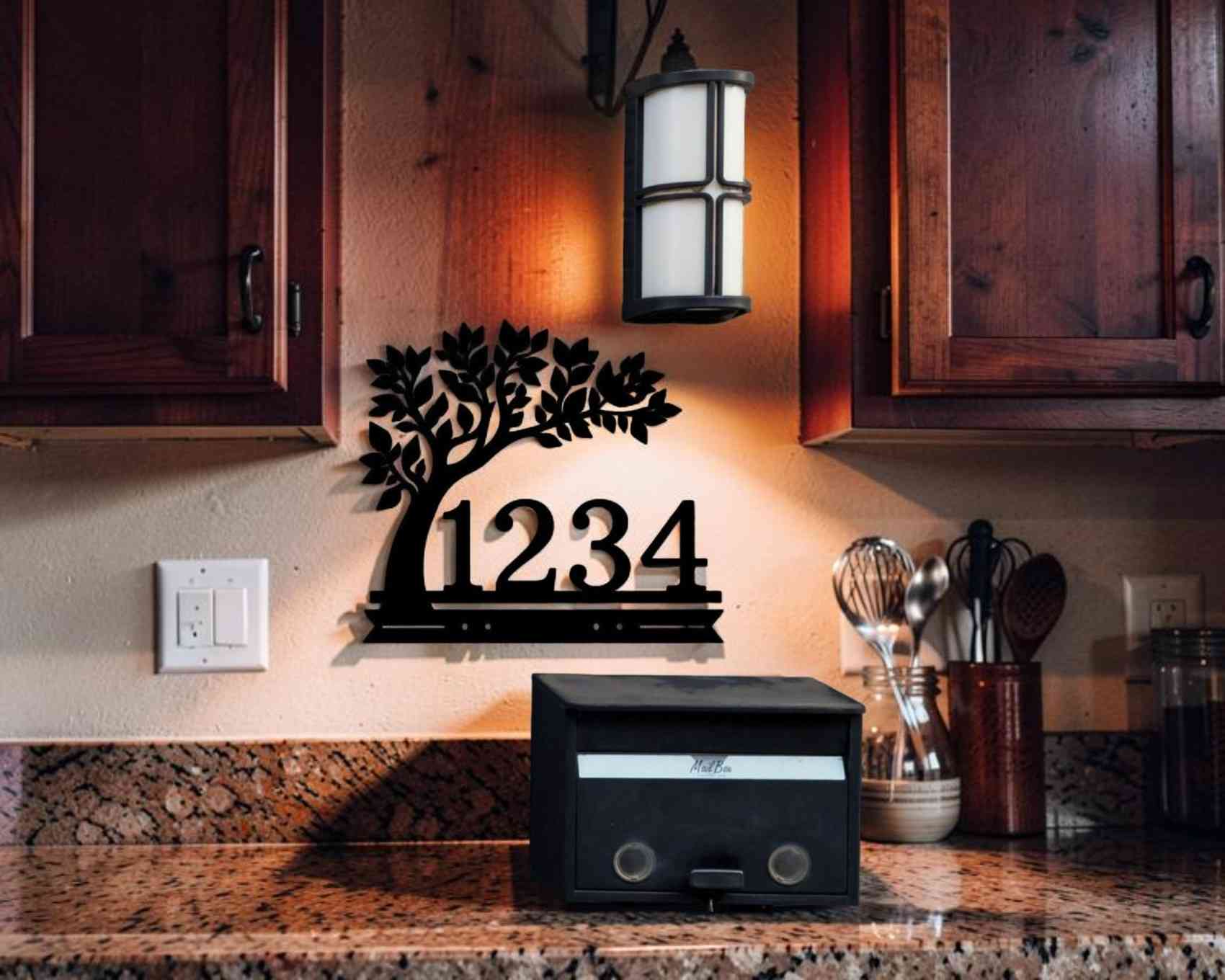Este diseño combina el número de la casa con un elegante Árbol de la Vida para una placa decorativa única.