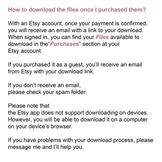 Los archivos estarán disponibles para descargar una vez que se confirme el pago. Si completaste la compra como invitado, encontrarás el enlace para descargar tu pedido en el recibo que se te enviara por correo electrónico después de confirmar el pago. Si tienes una cuenta en Files NC, una vez que completes la compra serás redirigido a la página de Descargas. Aquí puedes descargarte todos los archivos asociados con tu pedido. (Si no encuentra él recibió enviado a su correo; compruebe su carpeta de spam o correo no deseado. Si usas Gmail, comprueba también las pestañas Social y Promociones.)