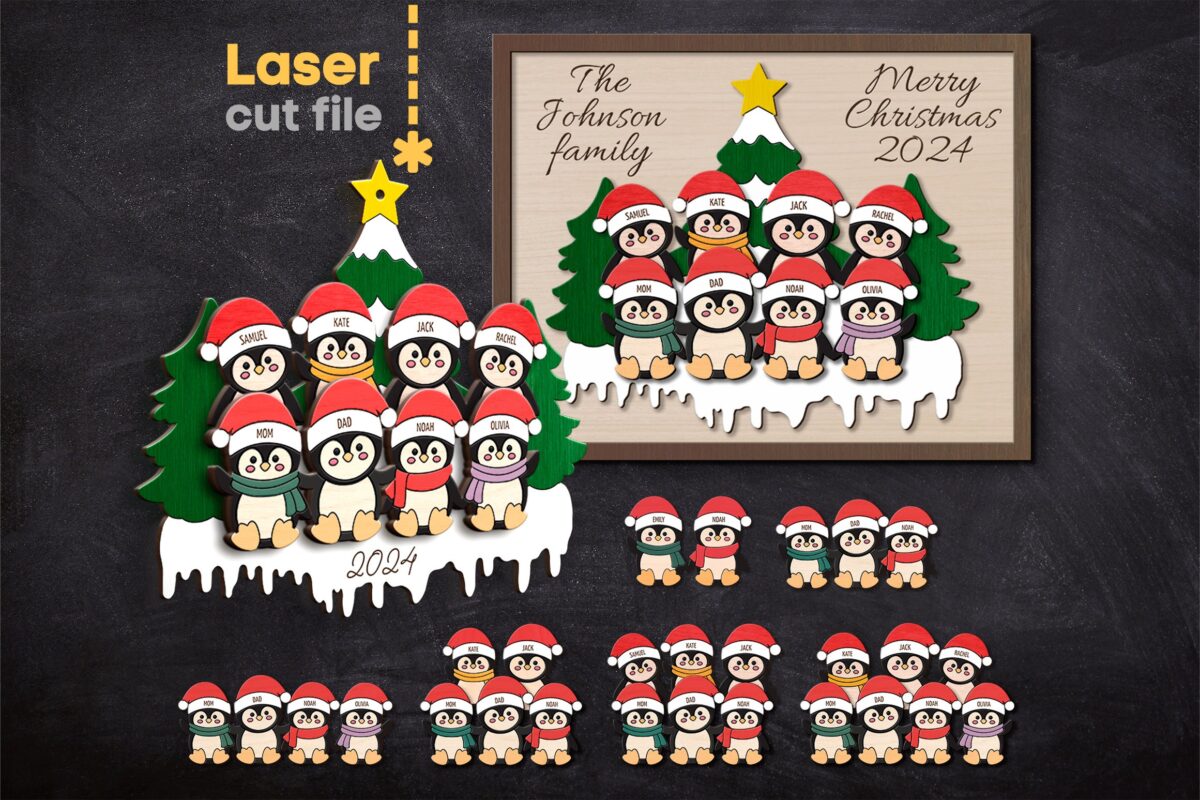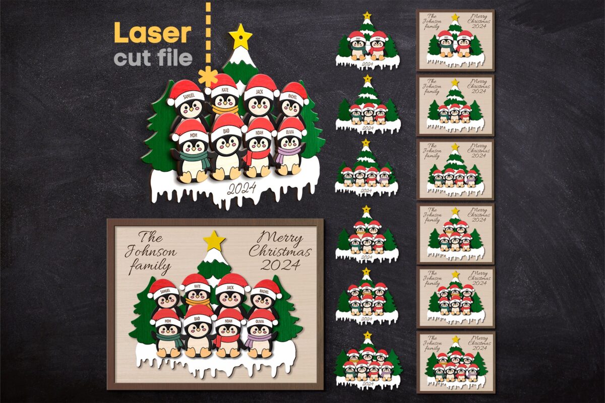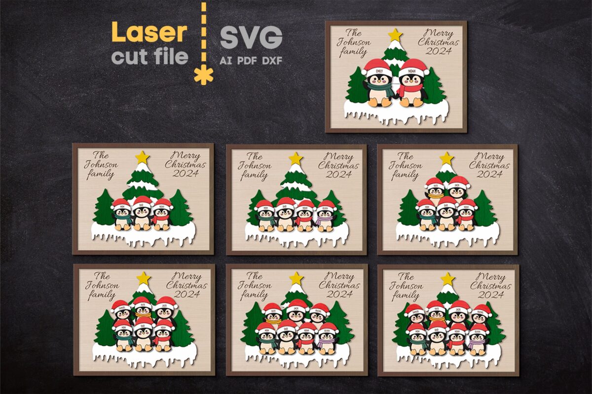 Paquete SVG de árbol genealógico de pingüinos para corte láser – Personaliza tu marco familiar de Navidad