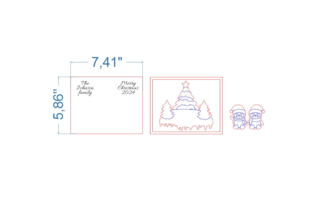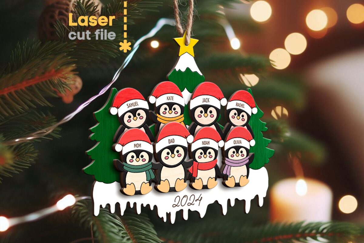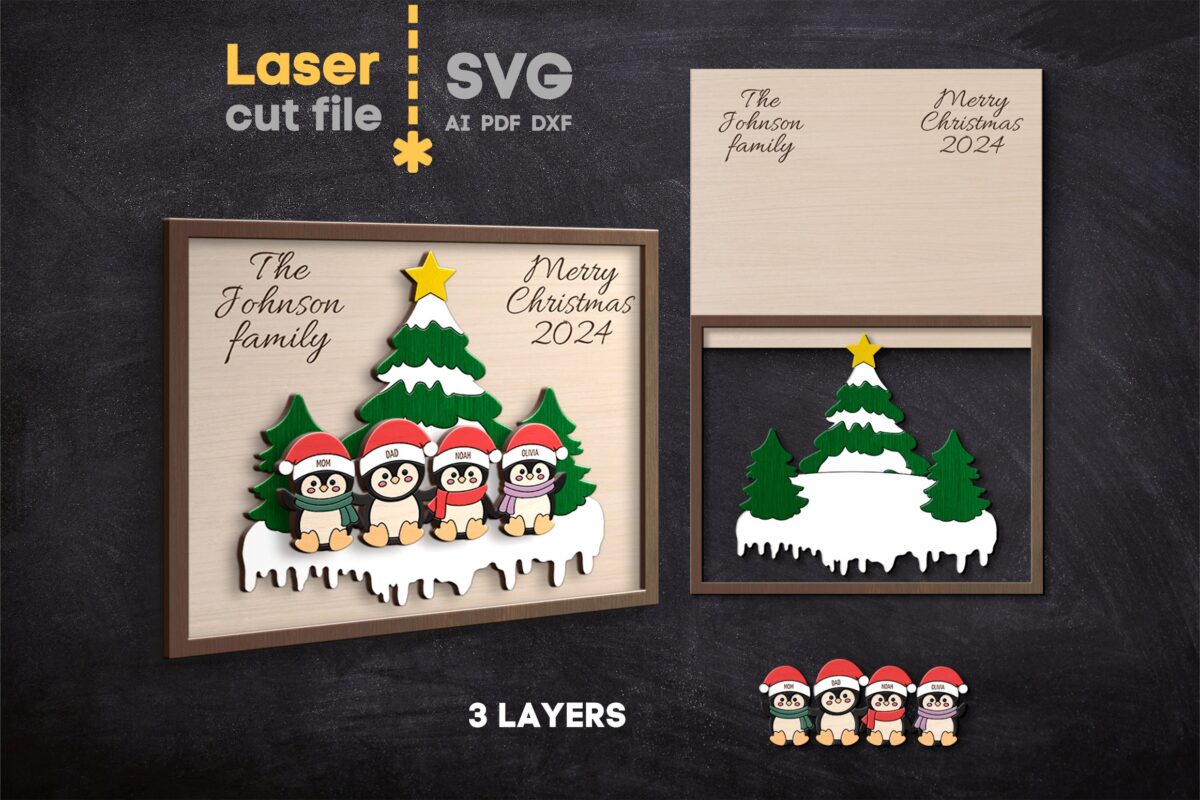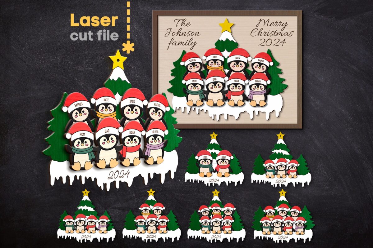 Paquete SVG de árbol genealógico de pingüinos para corte láser – Personaliza tu marco familiar de Navidad