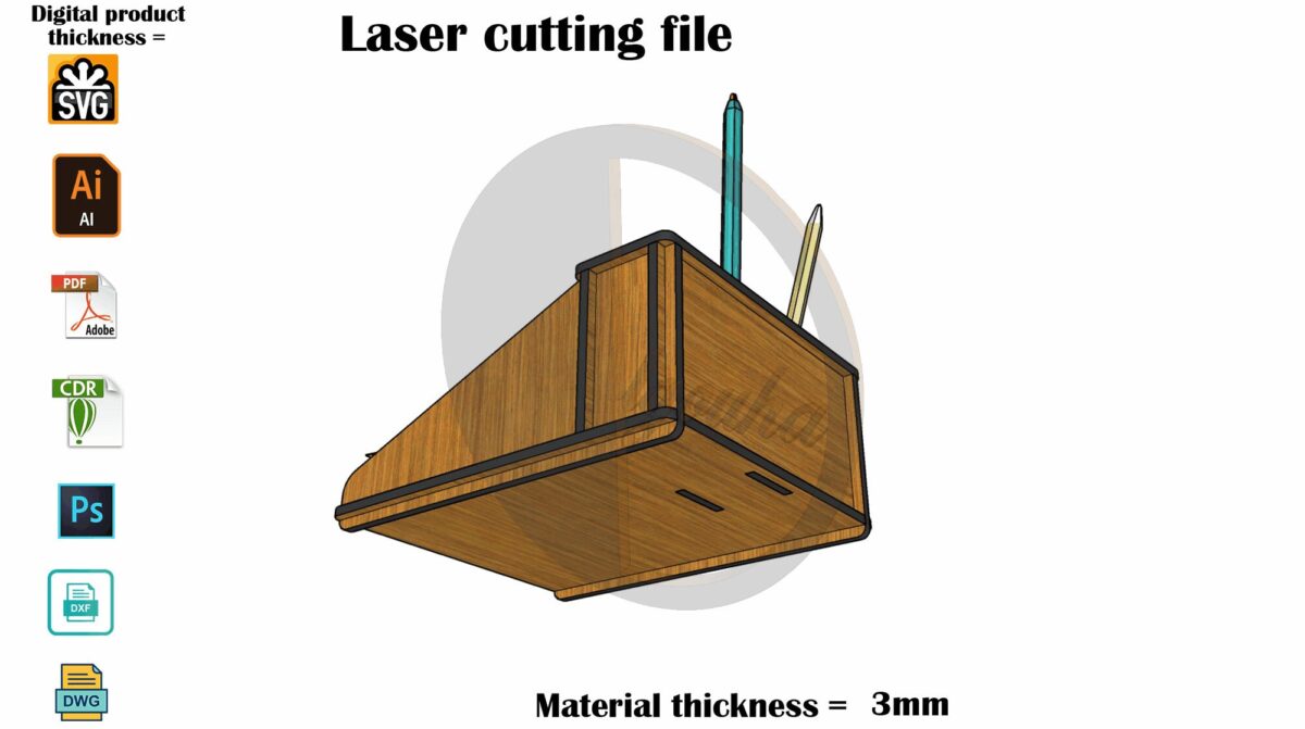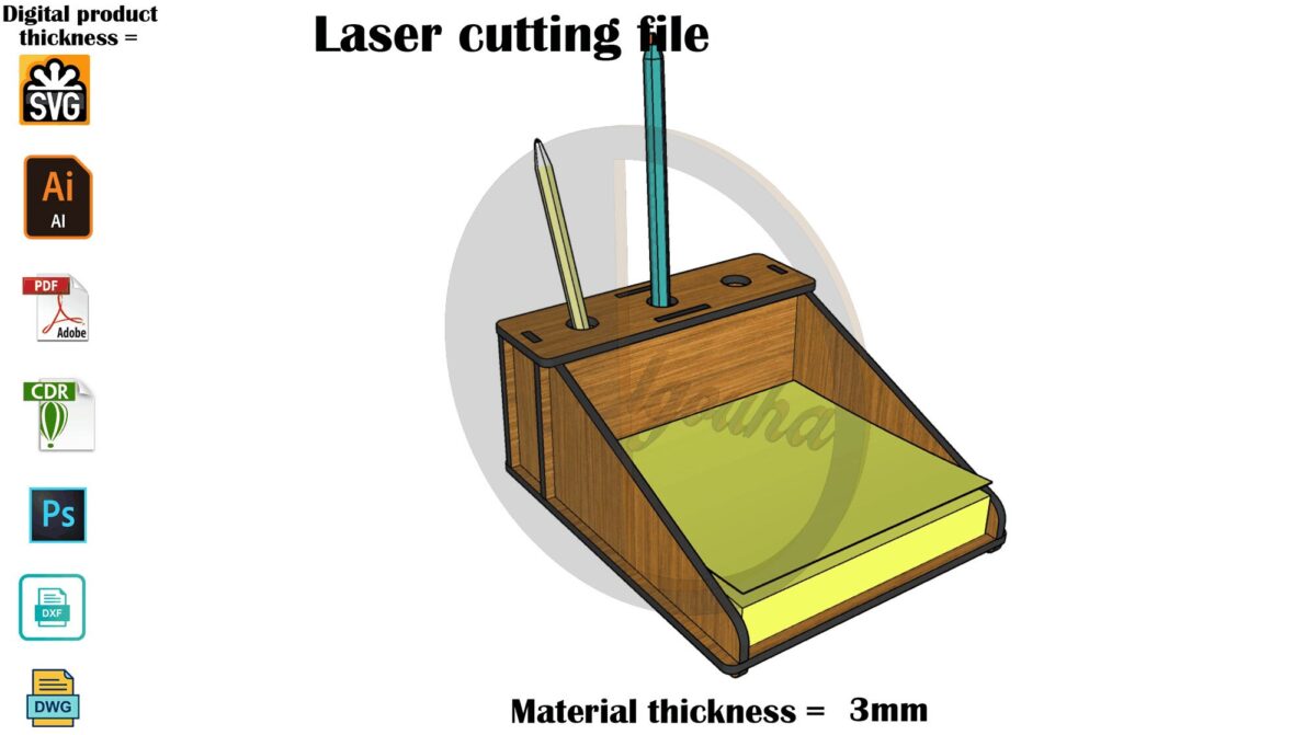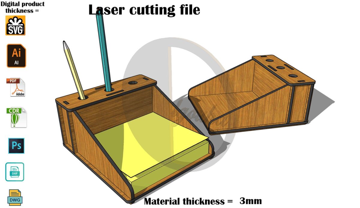 🖊️ ¡Transforma tu escritorio con nuestro elegante portalápices cortado a láser! Este diseño innovador incluye un bloc de notas de 3 mm, perfecto para mantener tus herramientas de escritura organizadas y accesibles.