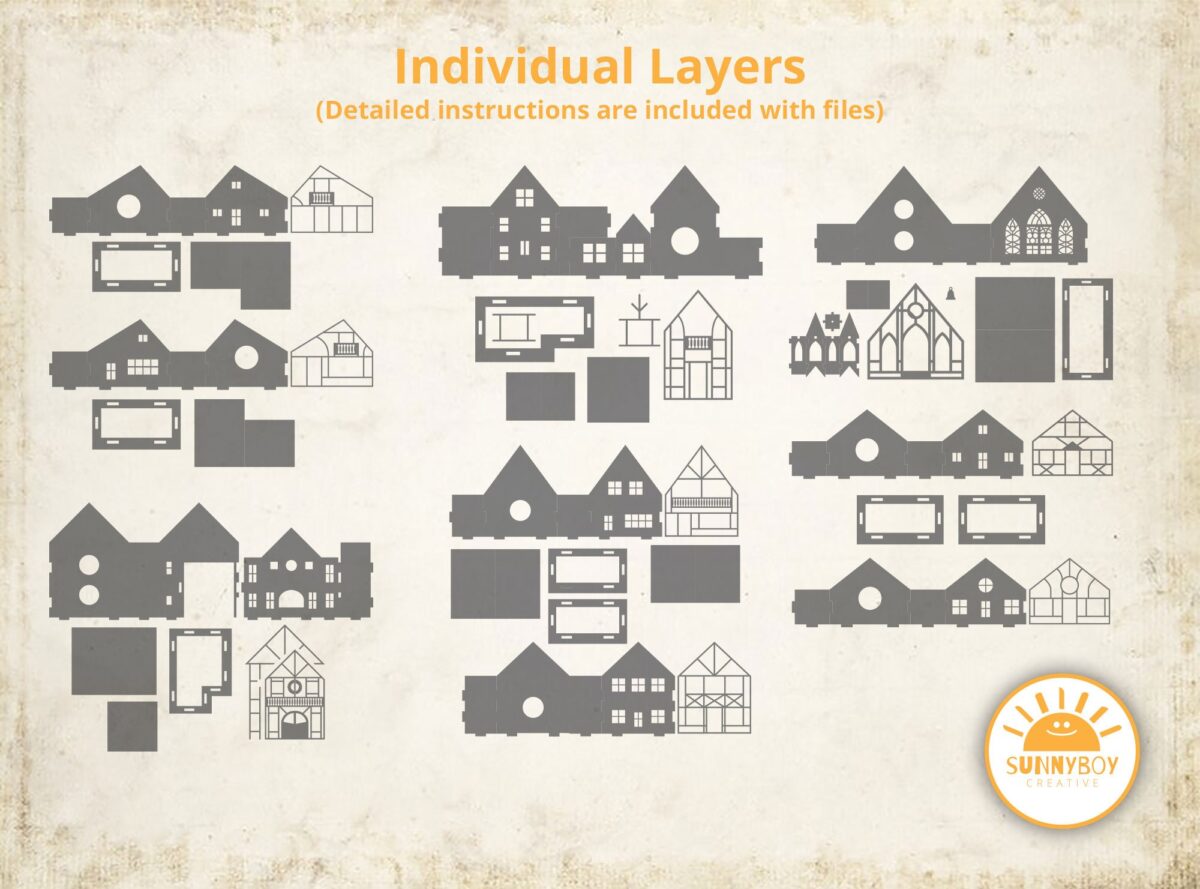 🏠 Cada diseño presenta edificios distintivos, incluyendo una pintoresca iglesia antigua, y viene marcado con letras para facilitar su montaje. Las líneas de corte y marcado detalladas aseguran una experiencia de creación fácil y satisfactoria. Puedes personalizarlos pintando o tiñendo las capas, ¡y cada edificio incluye una abertura para insertar luces y lograr un efecto mágico en tus decoraciones!