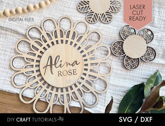 SVG para Corte Láser de Flores Boho, Nombre Personalizado en Madera, Archivos Glowforge