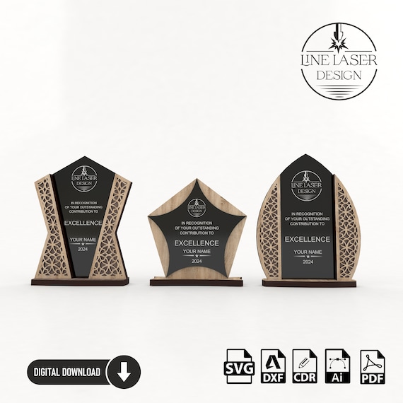 🏆 ¡Presentamos nuestros trofeos de corte láser con 3 diseños únicos en archivos SVG! Estos increíbles archivos son perfectos para crear premios personalizados en madera y plexiglás, ideales para cualquier ocasión especial. ✨