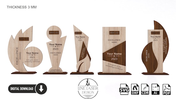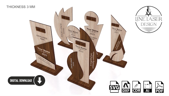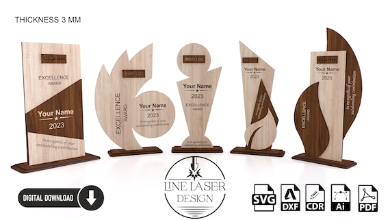 🏆 ¡Celebra los logros con nuestro Trofeo de Madera Cortado a Láser! Diseñado para crear premios personalizados únicos, este producto digital incluye 5 diseños SVG que puedes utilizar para tus proyectos creativos.